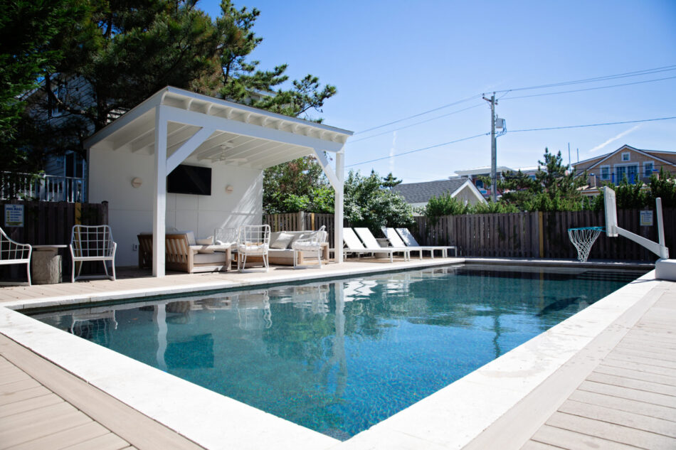 The new backyard is a complete transformation. A custom rectangular gunite pool now anchors the space, finished in a bold Pebble Sheen Ocean Blue that brings both depth and elegance. A built-in tanning ledge and two straight-line in-pool benches provide versatile seating and lounging areas, creating a space that’s ideal for entertaining or winding down.
