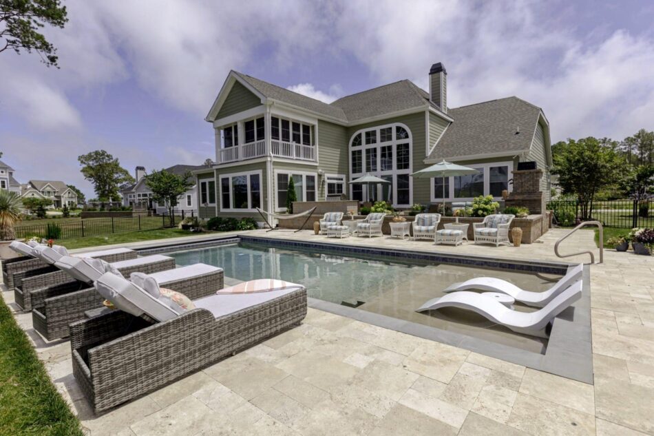 The Challenge - Our client called us and told us he wanted to get a pool built for "his girls". He wanted to add to his extraordinary Lewes, Delaware home by adding onto the existing builder built patio space and create a pool and lounge area that looked seamless and took advantage of the great bay views.