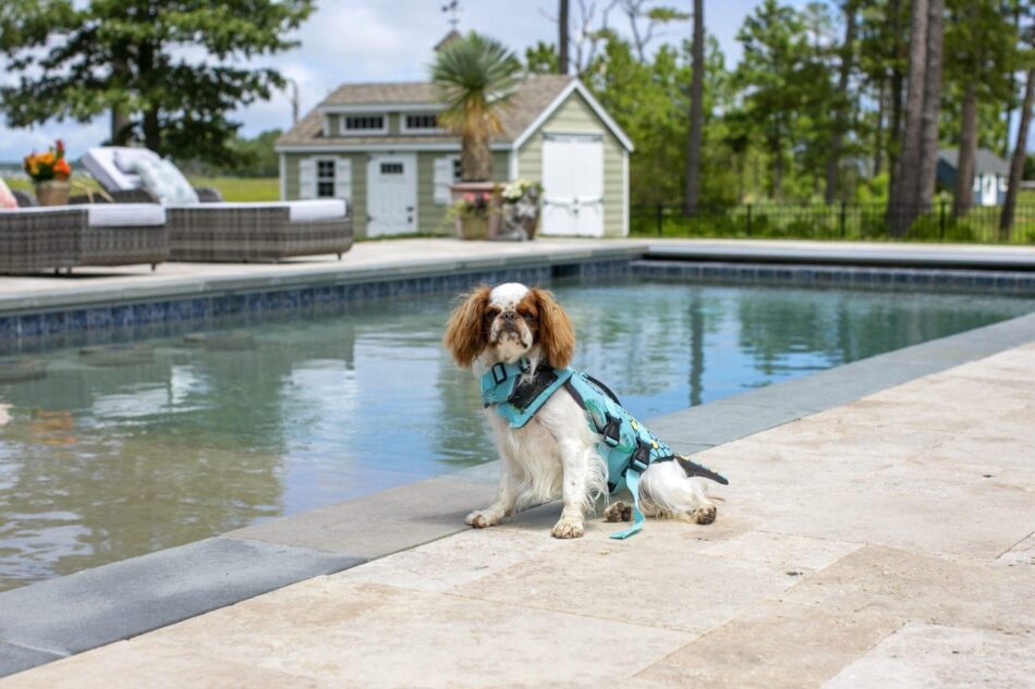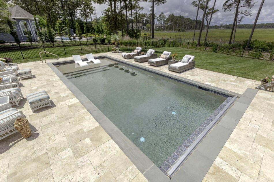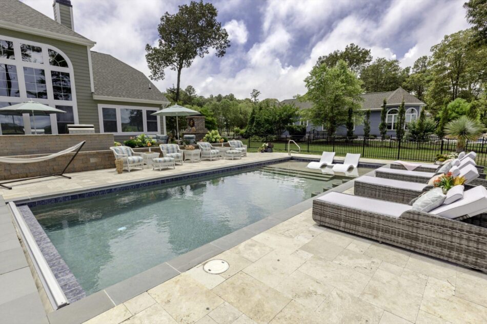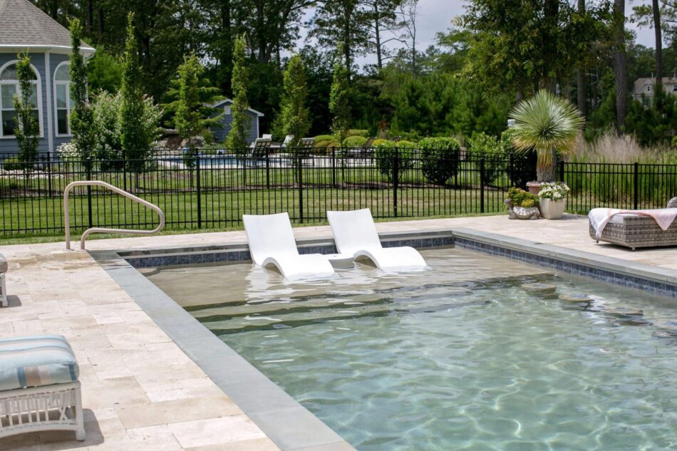 The Results – This pool is everything our client was looking for. From the fun bar stools in the pool to the large tanning ledge for the humans and the four legged friends! Add in that great Sandy Beach PebbleTec color and you have a space ready for a party, or a quiet moment taking in the natural beauty of the Rehoboth Bay.