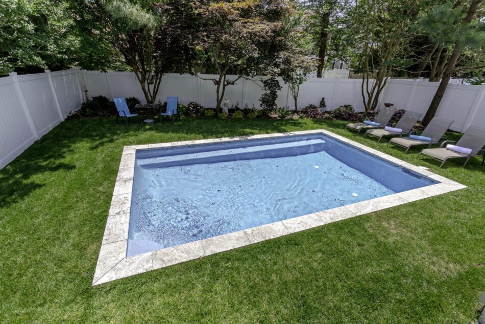 Due to a lot of coverage specifications, we weren’t able to add patio space. Joe was inspired by the Hamptons and laid the stunning silver travertine coping which runs into a beautiful new sod yard.