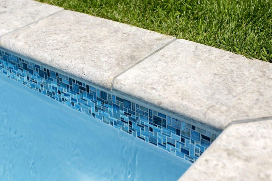 With a small pool, the tile and coping selections needed to shine. The homeowners picked a beautiful silver travertine coping for its natural beauty. They paired it with an intricate mosaic tile to compliment the Bella Blue PebbleFina® pool finish.