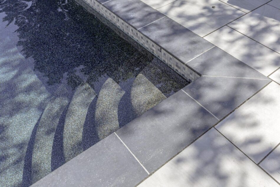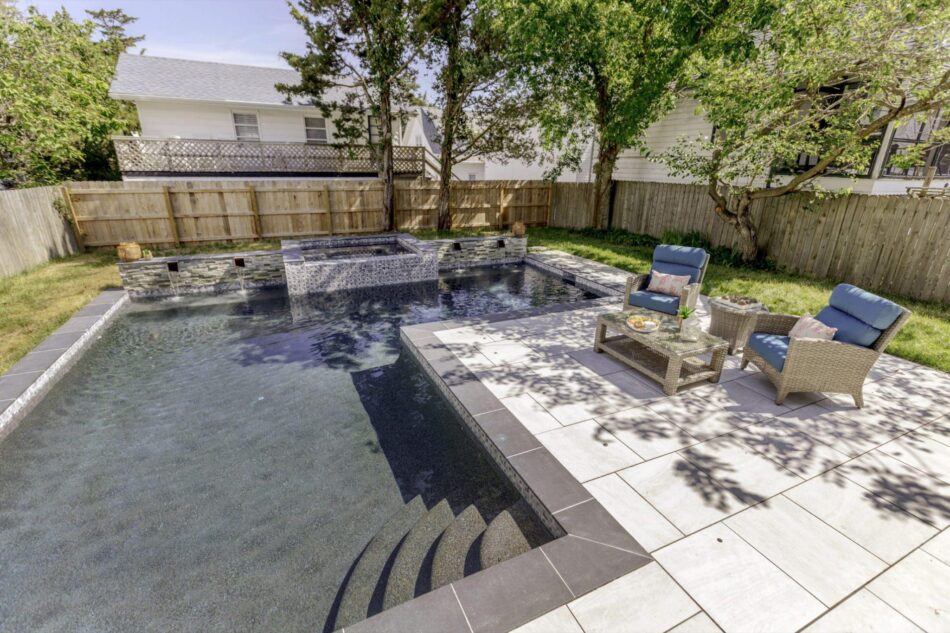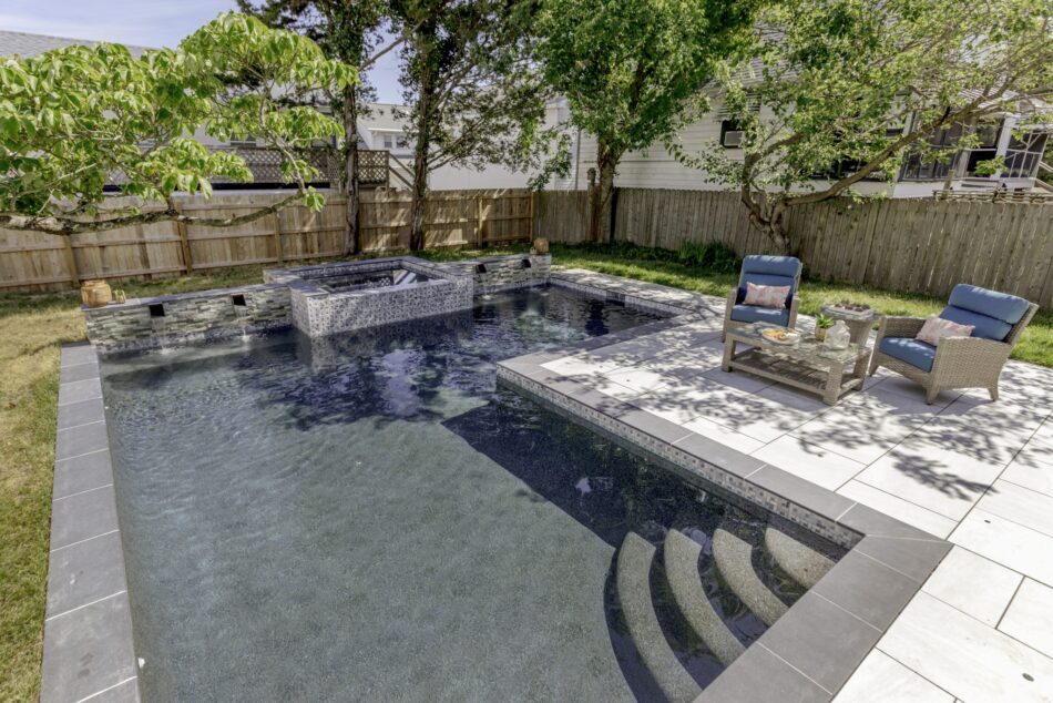 The Results – this swimming pool with all of the clean lines is an up to date backyard masterpiece. The clean water feature wall provides a visual backdrop to look at, rather then at the back of your neighbors home or their fence. The soothing waterfall sounds help to drown out any street noise and keep you focused on the pool and spa. The separate spa is close enough to watch the kids but a little intimate escape on its own. Add in more tranquil water sounds when you program the spa to spillover into the geometric swimming pool. Large steps make it easy to enter for the children and a center swim lane allows for some great exercise.