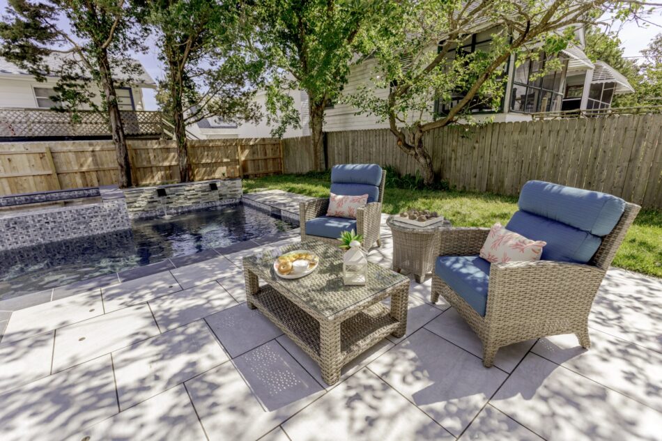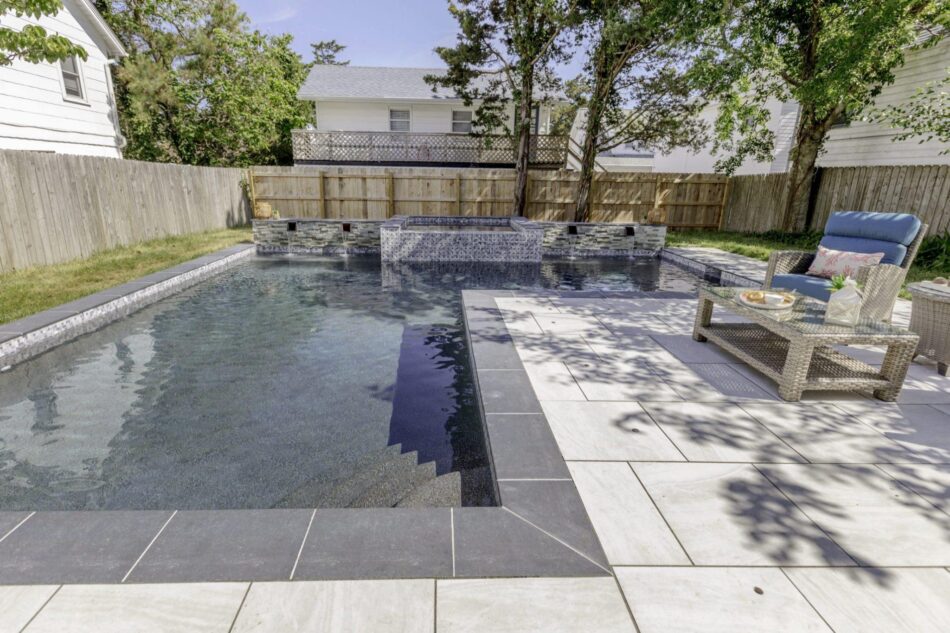 The Challenge - A young family in a an older ocean block home in Rehoboth Beach. They wanted a pool their little ones could use on crowded beach days or when the waves are too rough. They had an old back cottage and their lot was covered with old, unkept trees. Before we even knew what we could do we needed to meet with the city to find out if the trees could come down and what we could do with the decrepit cottage.