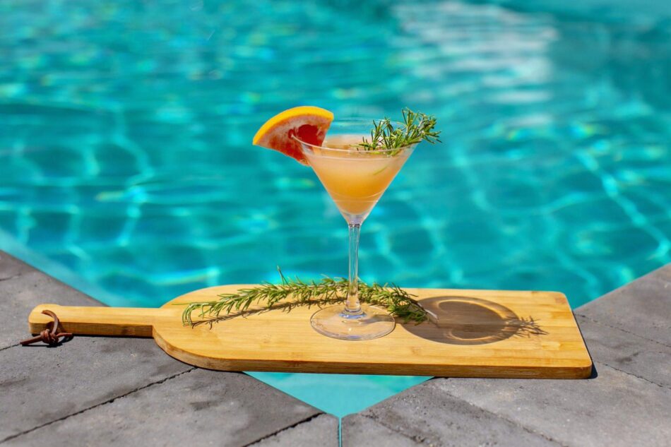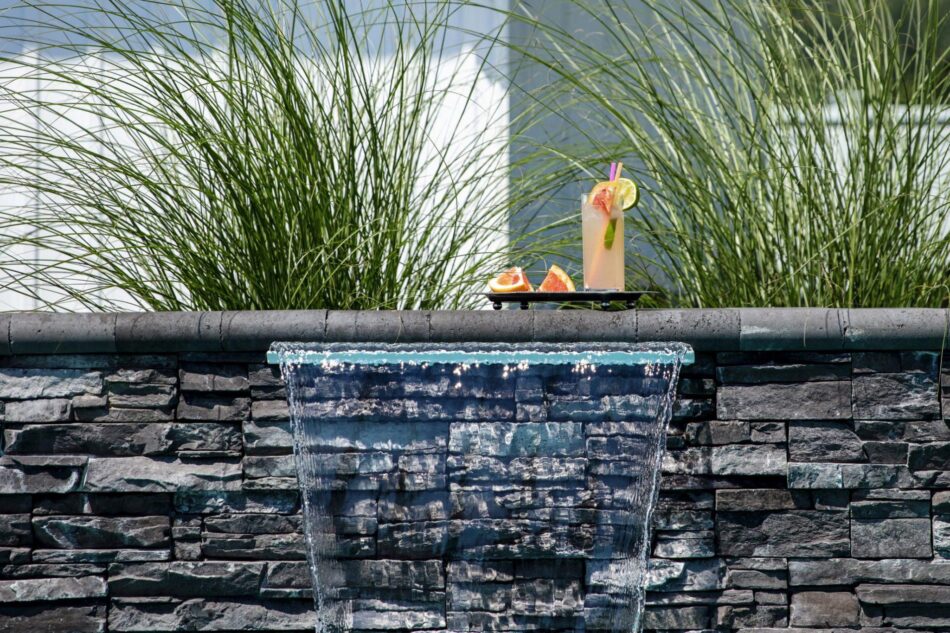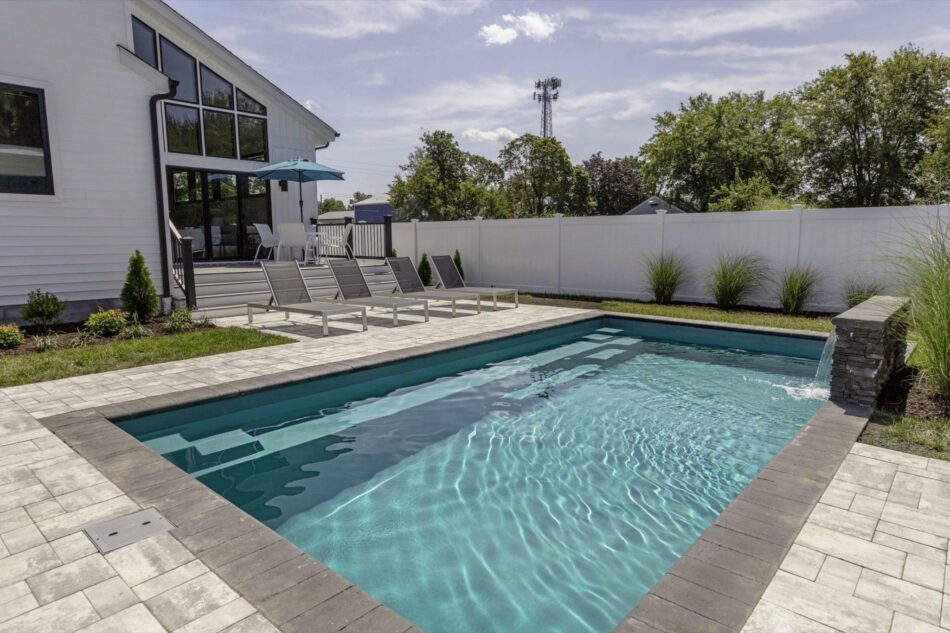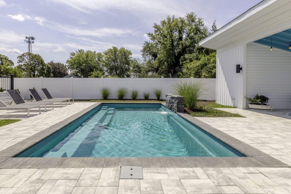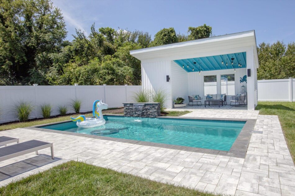The Result – Wow – how about that pop of color. A deep teal pool matched expertly by the custom home builder and stylishly used on the inside metal roof of the pool house. This house sits just outside the Rehoboth Beach city limits and on busy days its the perfect little hideaway to relax and have some afternoon cocktails and enjoy that unicorn pool float. Who needs the hustle and bustle when you have this whimsical pool house ready to go in your own backyard? Then add in the soothing sounds of the waterfall right into the pool – pure heaven if you ask us!
