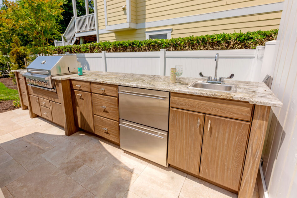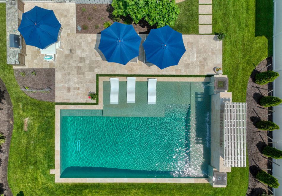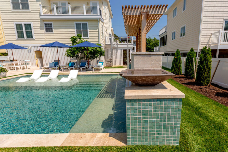 The Results – What emerged was a luxurious outdoor sanctuary. Anchored by a sprawling pool featuring an elegant tanning ledge spacious enough for the entire family, the design exudes sophistication and relaxation. A state-of-the-art outdoor kitchen, perfect for year-round entertaining, elevates the space’s functionality. Cascading waterfalls and artisanal water pots not only enhance the aesthetics but also provide a tranquil soundscape, shielding the oasis from road noise. This backyard is now the epitome of refined leisure, offering a hardworking family the ultimate escape in their own home.